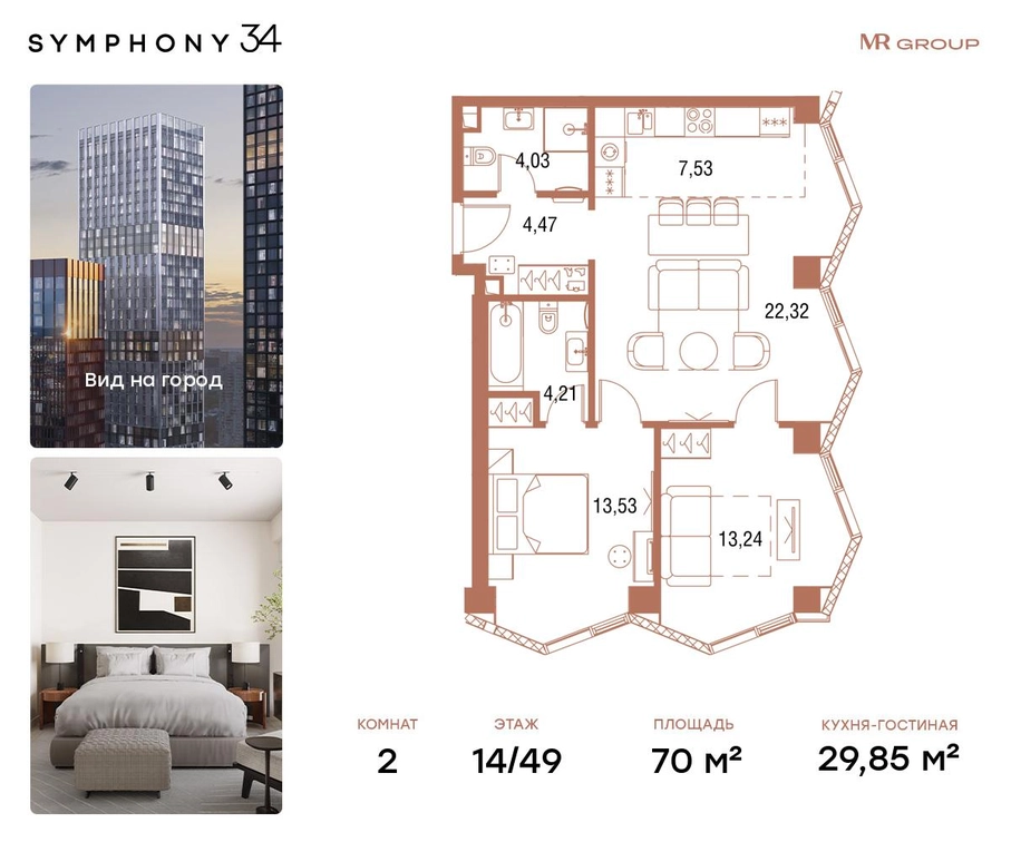 В продаже 2-комнатная квартира площадью 70 кв.м. с отделкой MR Base на 14-м этаже 49 этажного дома.