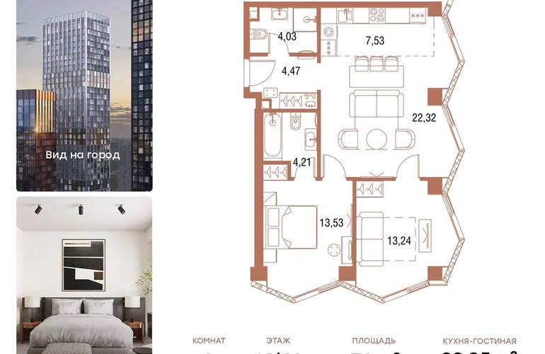 В продаже 2-комнатная квартира площадью 70 кв.м. с отделкой MR Base на 14-м этаже 49 этажного дома.