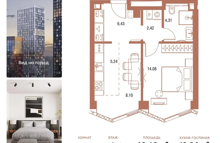 В продаже 1-комнатная квартира площадью 41,3 кв.м. с отделкой MR Base на 16-м этаже 49 этажного дома.