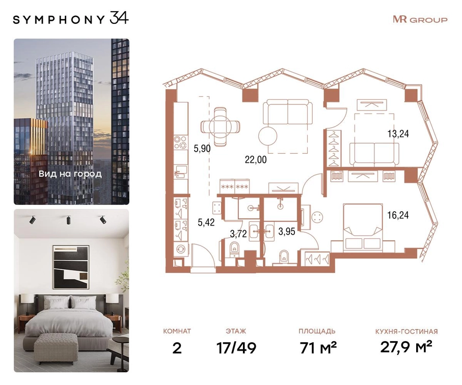 В продаже 2-комнатная квартира площадью 71 кв.м. с отделкой MR Base на 17-м этаже 49 этажного дома.