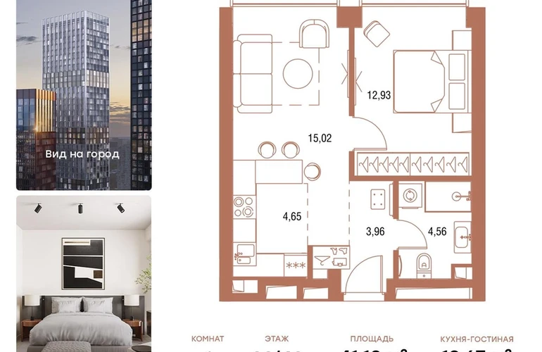 В продаже 1-комнатная квартира площадью 41,2 кв.м. с отделкой MR Base на 22-м этаже 49 этажного дома.