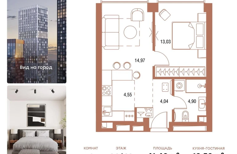 В продаже 1-комнатная квартира площадью 41,9 кв.м. с отделкой MR Base на 30-м этаже 49 этажного дома.