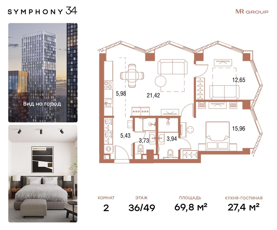 В продаже 2-комнатная квартира площадью 69,8 кв.м. с отделкой MR Base на 36-м этаже 49 этажного дома.