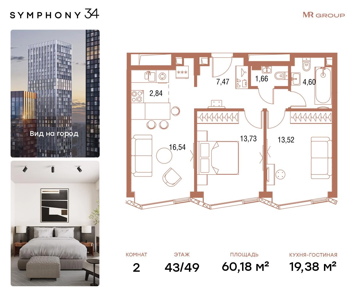 В продаже 2-комнатная квартира площадью 60,8 кв.м. с отделкой MR Base на 43-м этаже 49 этажного дома.