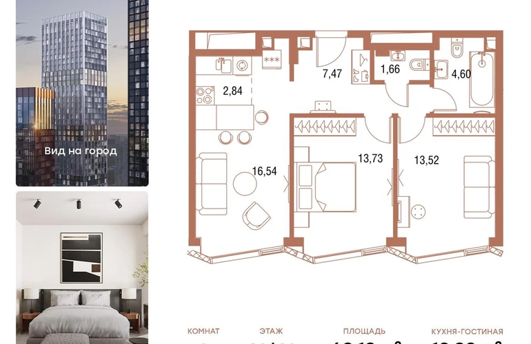 В продаже 2-комнатная квартира площадью 60,8 кв.м. с отделкой MR Base на 43-м этаже 49 этажного дома.