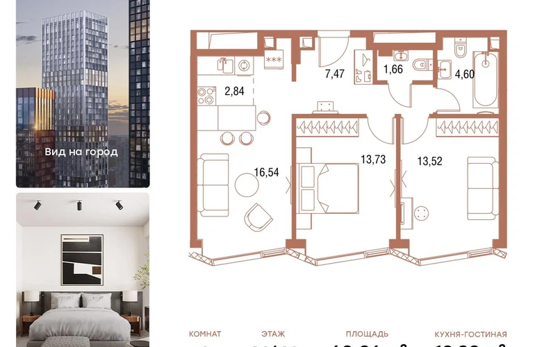 В продаже 2-комнатная квартира площадью 61,4 кв.м. с отделкой MR Base на 46-м этаже 49 этажного дома.