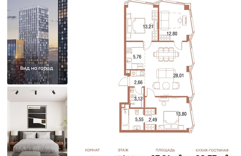 В продаже 3-комнатная квартира площадью 87,9 кв.м. с отделкой MR Base на 47-м этаже 49 этажного дома.