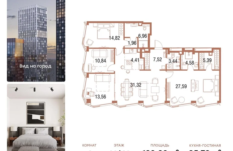 В продаже 4-комнатная квартира площадью 132,6 кв.м. с отделкой MR Base на 49-м этаже 49 этажного дома.