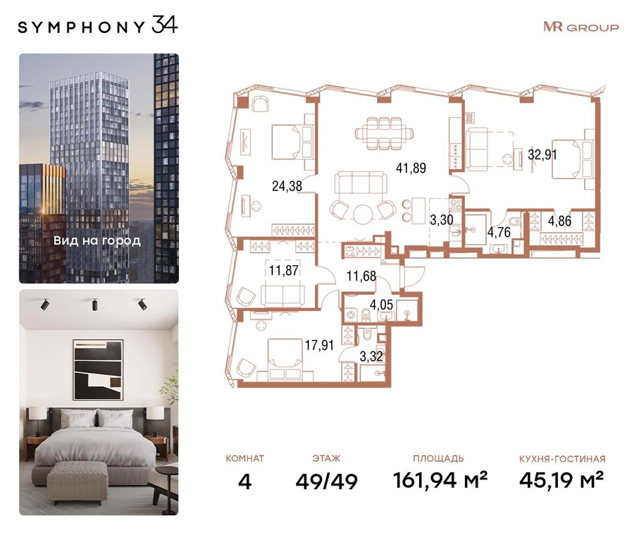В продаже 4-комнатная квартира площадью 158,9 кв.м. с отделкой MR Base на 49-м этаже 49 этажного дома.