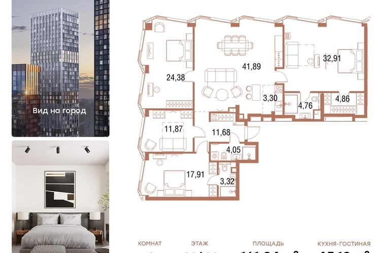 В продаже 4-комнатная квартира площадью 158,9 кв.м. с отделкой MR Base на 49-м этаже 49 этажного дома.