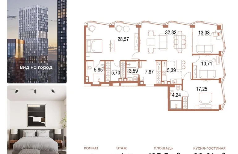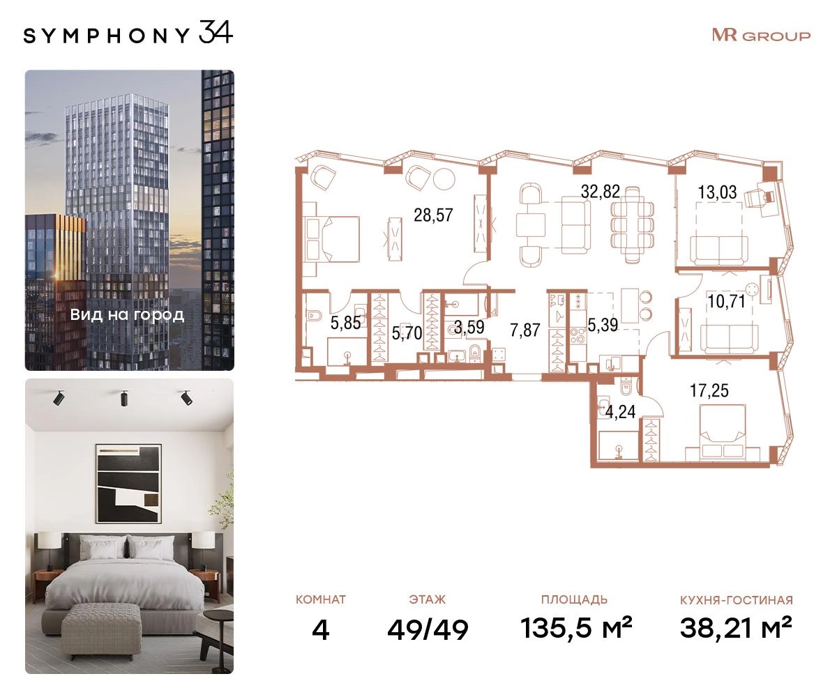 В продаже 4-комнатная квартира площадью 135,5 кв.м. с отделкой MR Base на 49-м этаже 49 этажного дома.