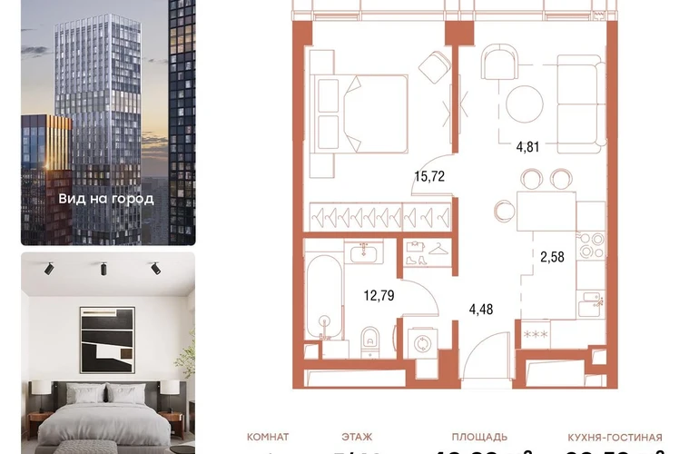 В продаже 1-комнатная квартира площадью 40,9 кв.м. с отделкой MR Base на 5-м этаже 43 этажного дома.
