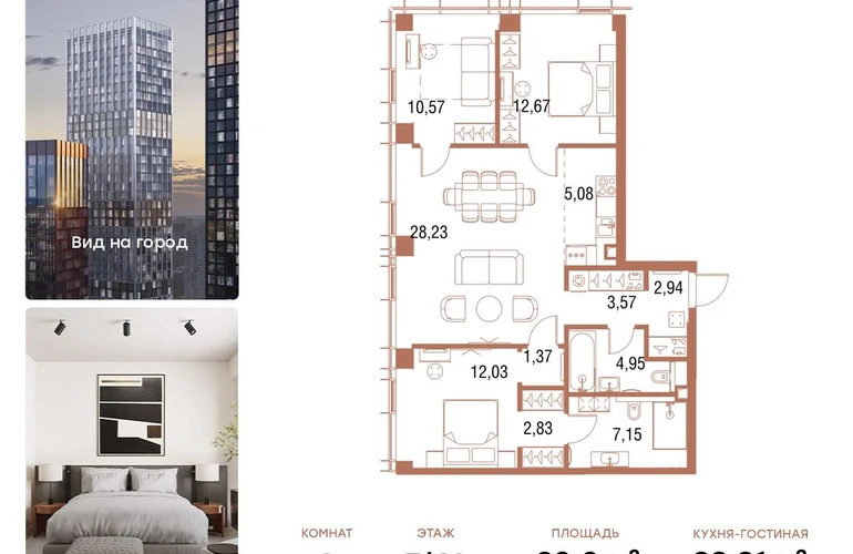 В продаже 3-комнатная квартира площадью 92,2 кв.м. с отделкой MR Base на 7-м этаже 43 этажного дома.