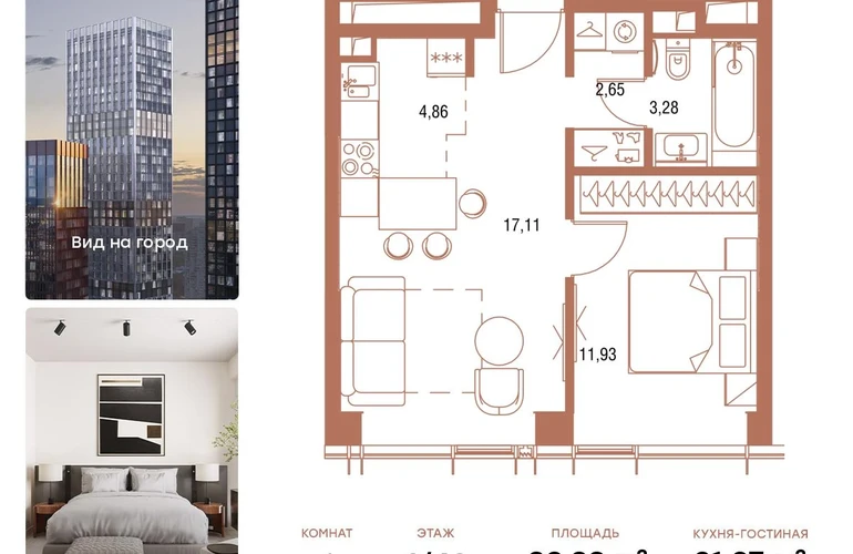 В продаже 1-комнатная квартира площадью 40,4 кв.м. с отделкой MR Base на 9-м этаже 43 этажного дома.