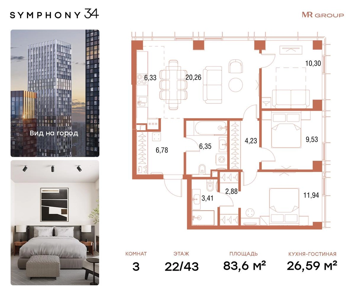 В продаже 3-комнатная квартира площадью 83,6 кв.м. с отделкой MR Base на 22-м этаже 43 этажного дома.