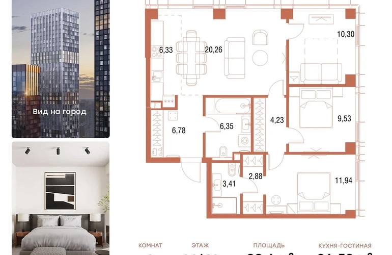 В продаже 3-комнатная квартира площадью 83,6 кв.м. с отделкой MR Base на 22-м этаже 43 этажного дома.