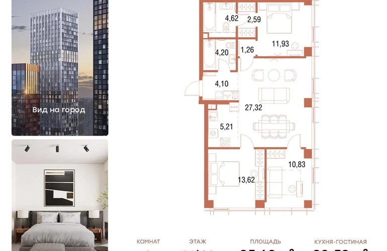 В продаже 3-комнатная квартира площадью 86,8 кв.м. с отделкой MR Base на 31-м этаже 43 этажного дома.