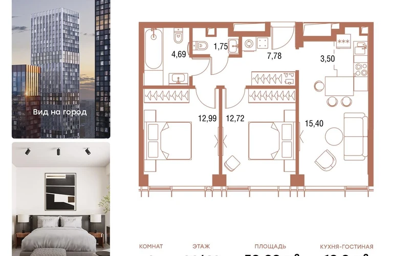 В продаже 2-комнатная квартира площадью 59,2 кв.м. с отделкой MR Base на 33-м этаже 43 этажного дома.