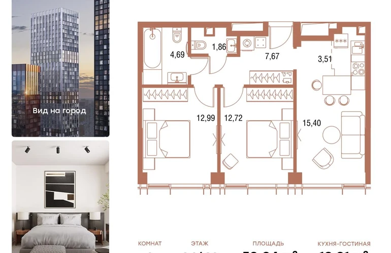 В продаже 2-комнатная квартира площадью 59,3 кв.м. с отделкой MR Base на 36-м этаже 43 этажного дома.