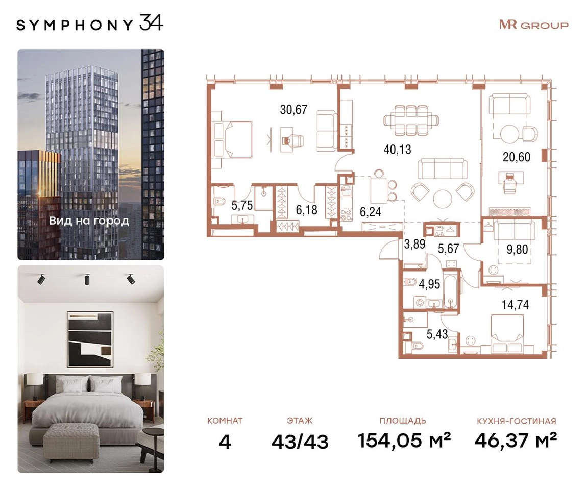 В продаже 4-комнатная квартира площадью 153,2 кв.м. с отделкой MR Base на 43-м этаже 43 этажного дома.