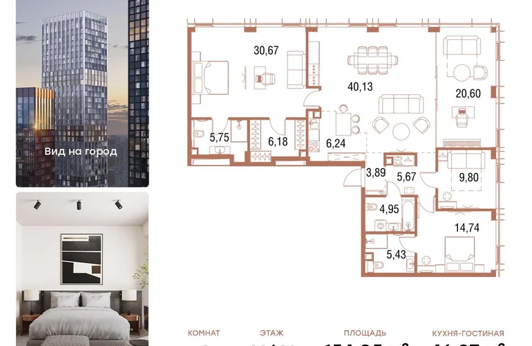 В продаже 4-комнатная квартира площадью 153,2 кв.м. с отделкой MR Base на 43-м этаже 43 этажного дома.