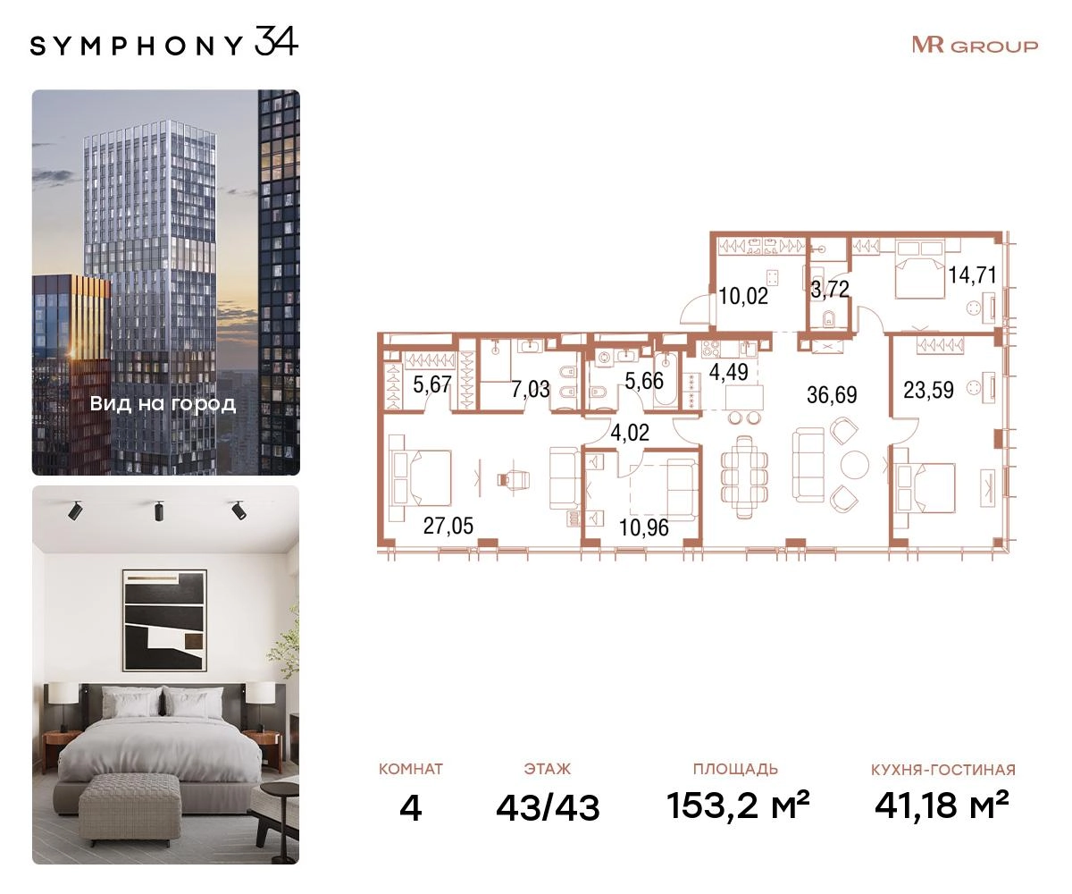 В продаже 4-комнатная квартира площадью 153,2 кв.м. с отделкой MR Base на 43-м этаже 43 этажного дома.