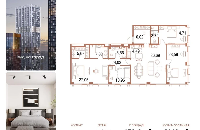 В продаже 4-комнатная квартира площадью 153,2 кв.м. с отделкой MR Base на 43-м этаже 43 этажного дома.