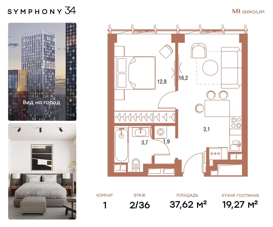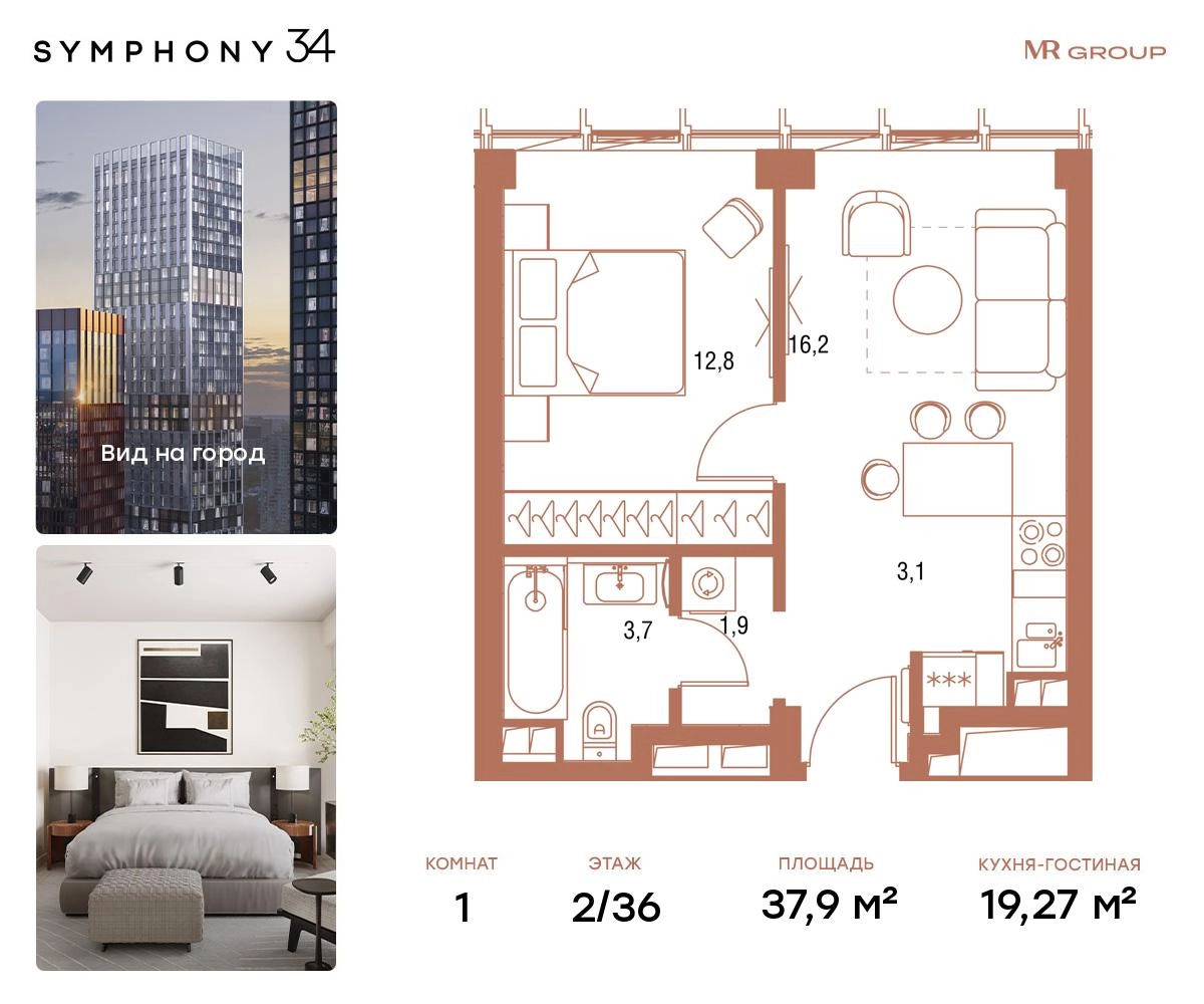 В продаже 1-комнатная квартира площадью 37,9 кв.м. с отделкой MR Ready на 2-м этаже 36 этажного дома.