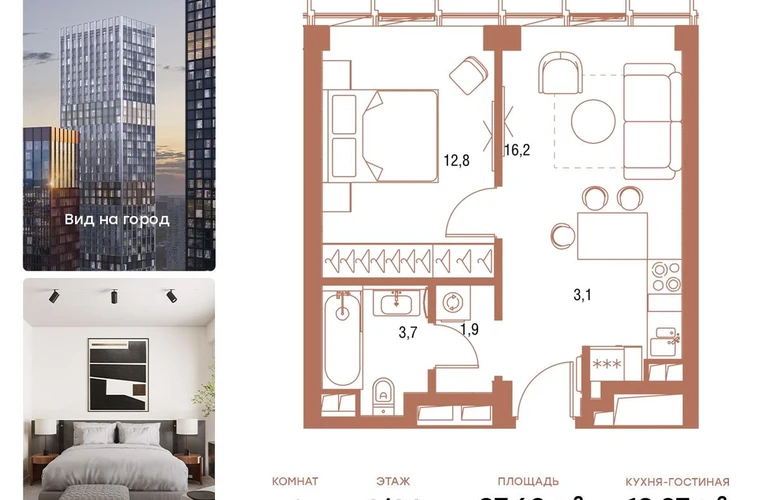 В продаже 1-комнатная квартира площадью 37,9 кв.м. с отделкой MR Ready на 2-м этаже 36 этажного дома.