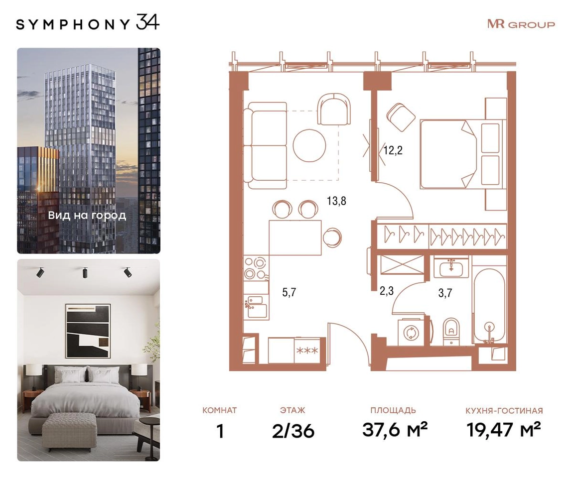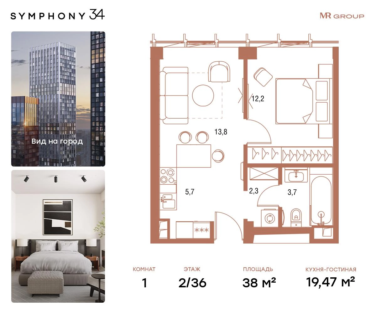 В продаже 1-комнатная квартира площадью 38 кв.м. с отделкой MR Ready на 2-м этаже 36 этажного дома.