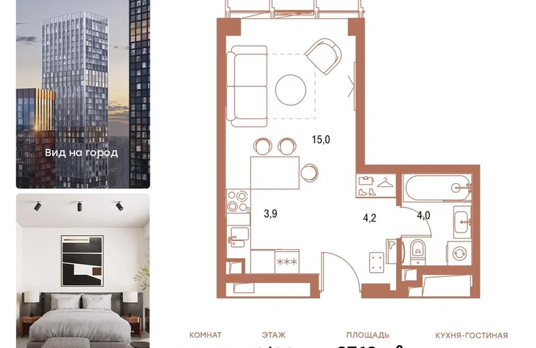 В продаже Студия площадью 27,1 кв.м. с отделкой MR Ready на 3-м этаже 36 этажного дома.