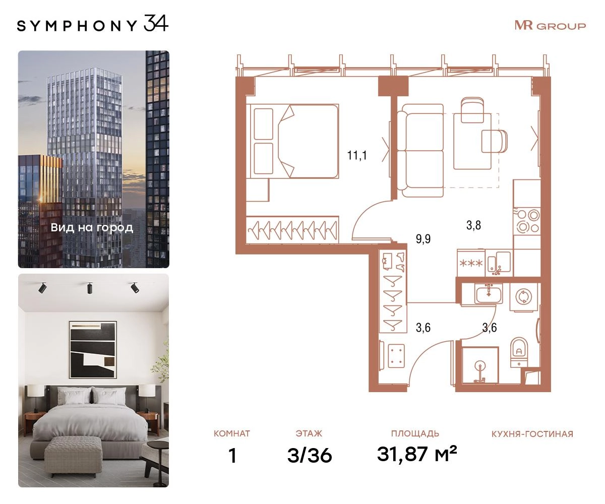 В продаже 1-комнатная квартира площадью 31,8 кв.м. с отделкой MR Ready на 3-м этаже 36 этажного дома.