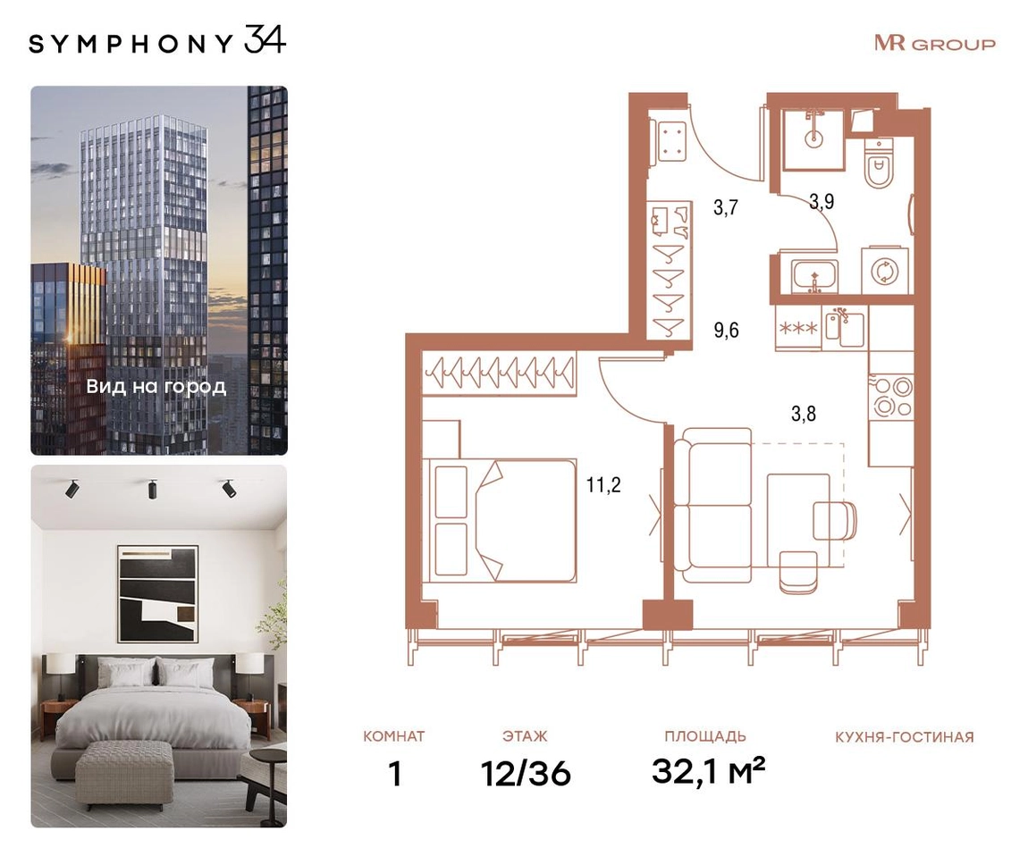 В продаже 1-комнатная квартира площадью 32,1 кв.м. с отделкой MR Ready на 12-м этаже 36 этажного дома.