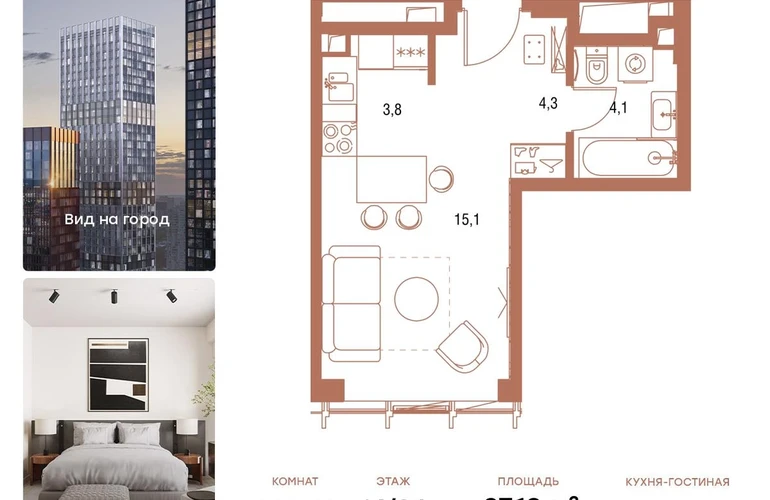 В продаже Студия площадью 27,2 кв.м. с отделкой MR Ready на 14-м этаже 36 этажного дома.