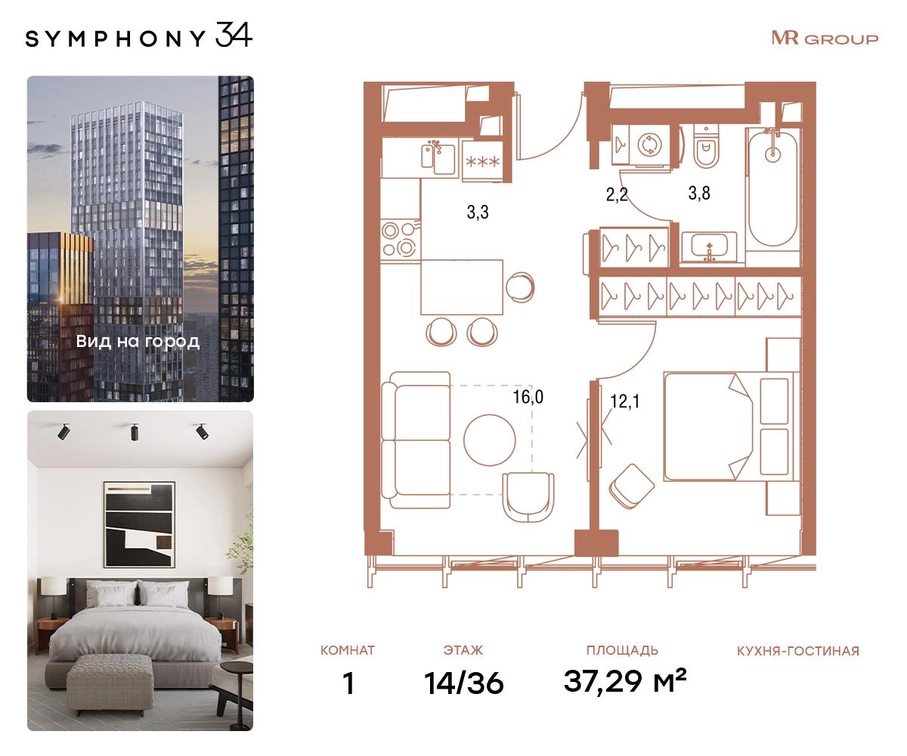 В продаже 1-комнатная квартира площадью 37,4 кв.м. с отделкой MR Ready на 14-м этаже 36 этажного дома.