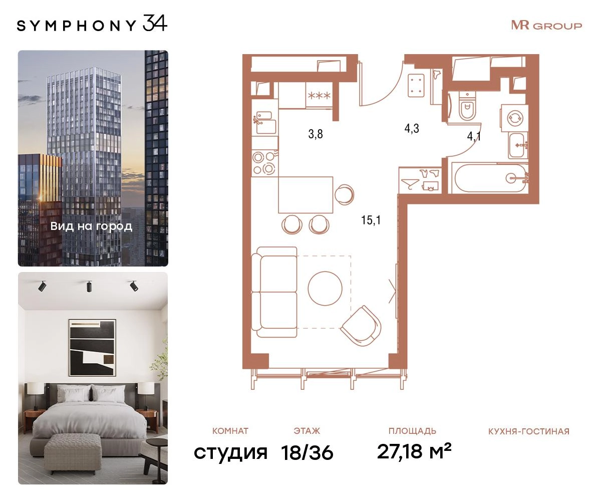 В продаже Студия площадью 27,1 кв.м. с отделкой MR Ready на 18-м этаже 36 этажного дома.