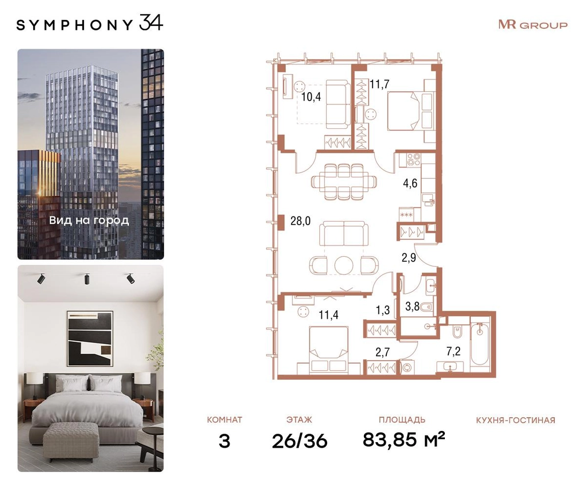 В продаже 3-комнатная квартира площадью 84 кв.м. с отделкой MR Ready на 26-м этаже 36 этажного дома.