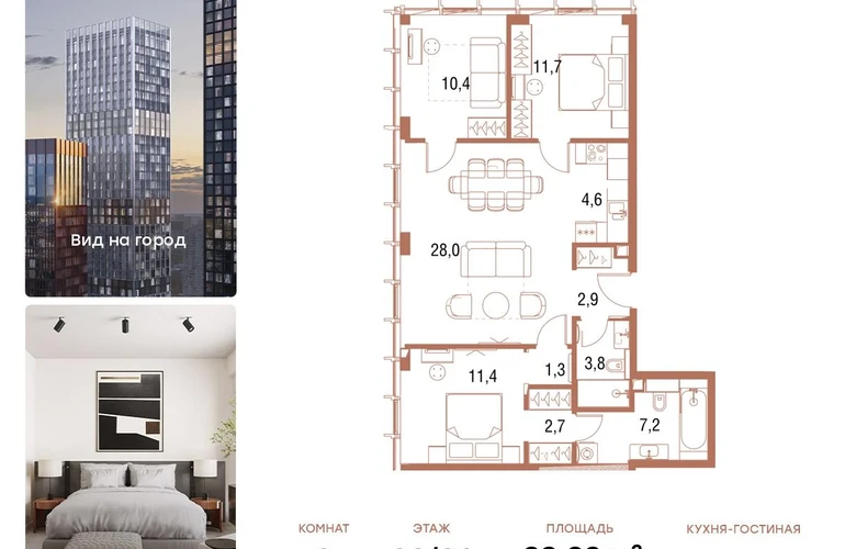 В продаже 3-комнатная квартира площадью 84,3 кв.м. с отделкой MR Ready на 30-м этаже 36 этажного дома.