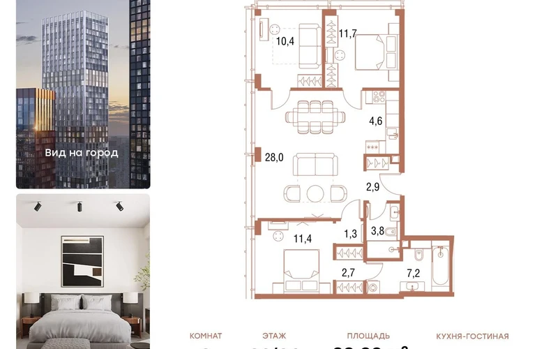 В продаже 3-комнатная квартира площадью 83,9 кв.м. с отделкой MR Ready на 32-м этаже 36 этажного дома.