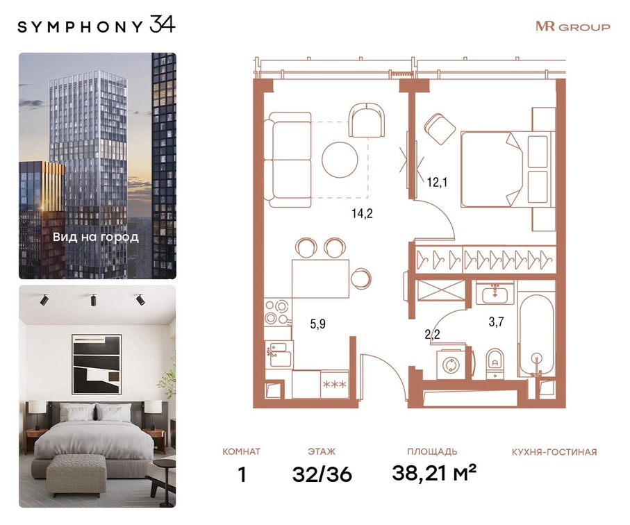 В продаже 1-комнатная квартира площадью 38,4 кв.м. с отделкой MR Ready на 32-м этаже 36 этажного дома.