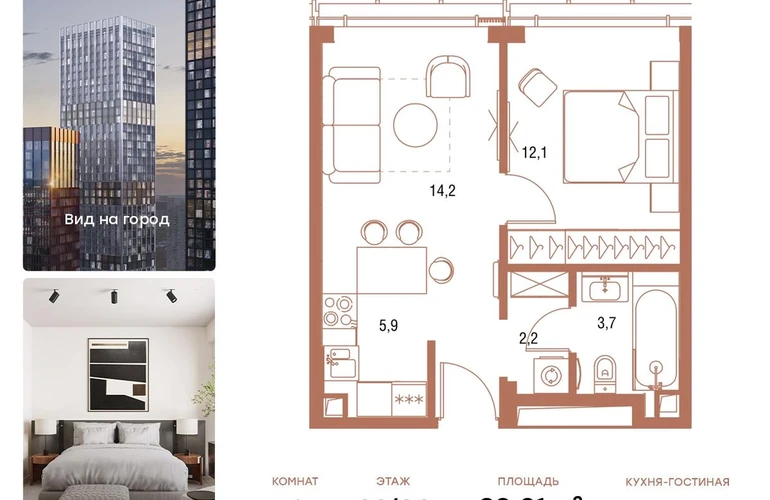 В продаже 1-комнатная квартира площадью 38,4 кв.м. с отделкой MR Ready на 32-м этаже 36 этажного дома.
