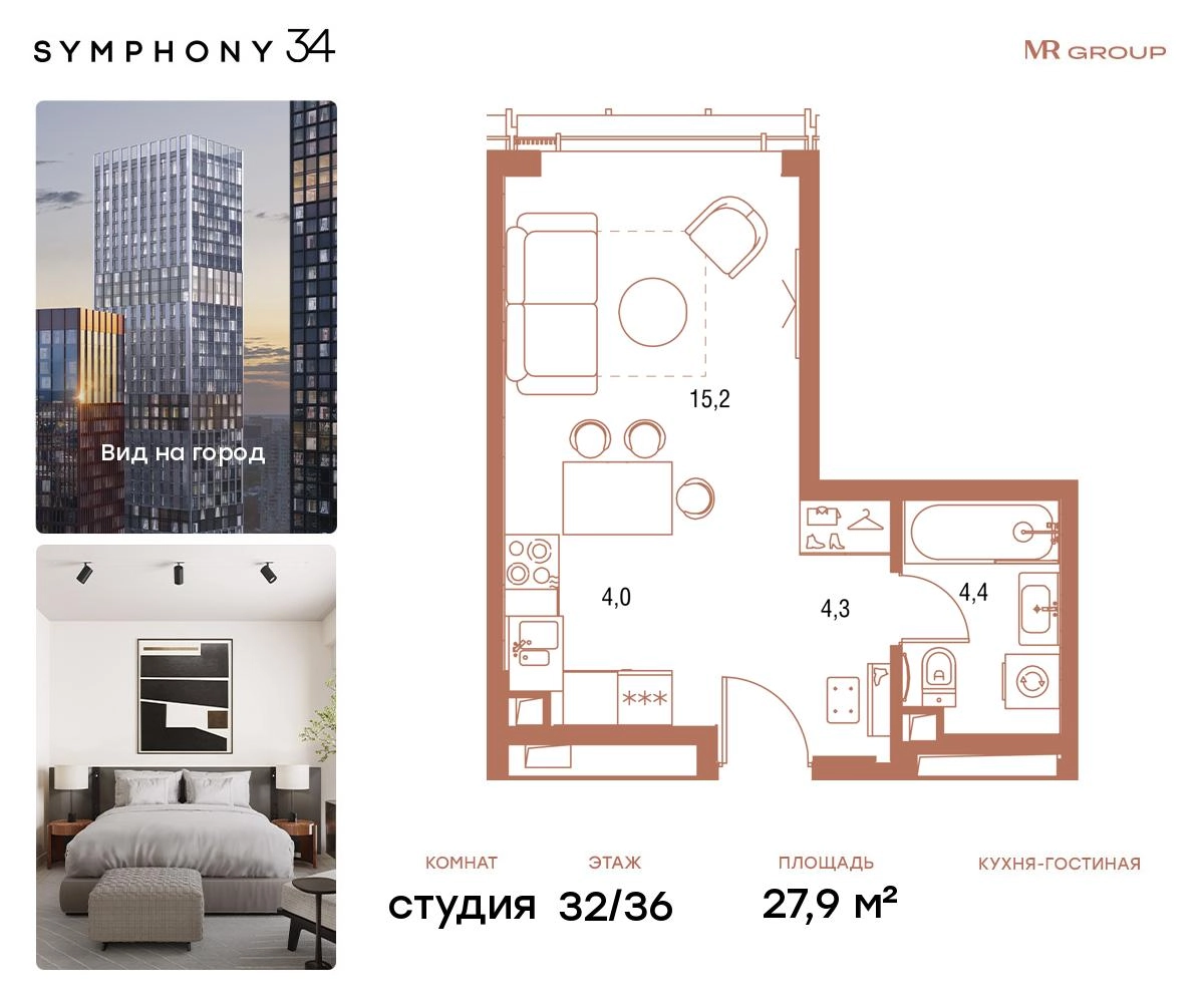 В продаже Студия площадью 27,9 кв.м. с отделкой MR Ready на 32-м этаже 36 этажного дома.