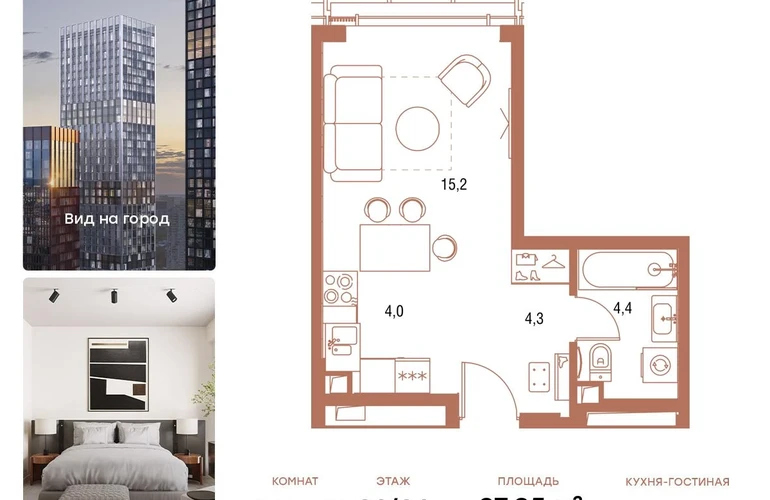 В продаже Студия площадью 27,9 кв.м. с отделкой MR Ready на 32-м этаже 36 этажного дома.
