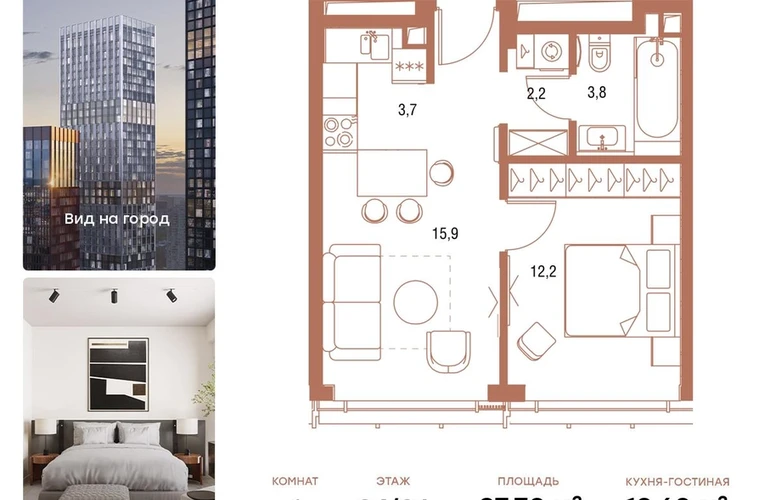 В продаже 1-комнатная квартира площадью 38 кв.м. с отделкой MR Ready на 34-м этаже 36 этажного дома.