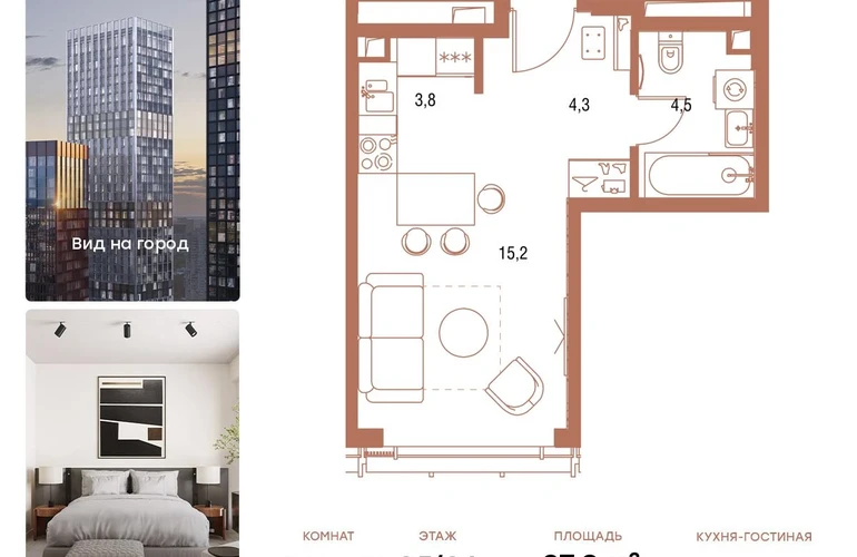 В продаже Студия площадью 27,8 кв.м. с отделкой MR Ready на 35-м этаже 36 этажного дома.