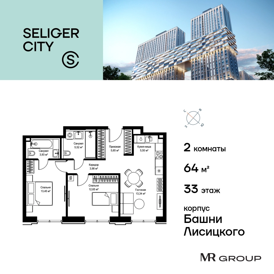 Прямая продажа от застройщика. Продаётся 2-к квартира общей площадью 64.02 кв. м с предчистовой отделкой в ЖК «Селигер Сити» на 33-м этаже башни Лисицкого. Корпуса четвертой очереди ЖК «Селигер сити» названы в честь трех великих представителей науки и архитектуры, новаторское видение которых — слишком смелое для своего времени — нашло воплощение в уникальных домах жилого комплекса. Вдохновленные авангардными идеями знаменитого советского архитектора Эля Лисицкого, архитекторы создали яркий центр притяжения всего района, задающий новый стандарт жизни в современном мегаполисе — две высокие «Башни Лисицкого» с современной интерпретацией горизонтального небоскреба. Преимущества проекта: Первые три очереди сданы. • 2 минуты пешком от метро «Селигерская» • Архитектурное решение от голландского бюро MLA + • 8 корпусов разной этажности от 8 до 45 этажей • Одна из самых больших придомовых территорий в Москве — размером с 4 футбольных поля • Огороженная охраняемая территория, круглосуточное видеонаблюдение • Европейский подход к благоустройству от бюро WOWHaus: детские площадки для разных возрастов, спортивные площадки, площадки воркаута, дорожки для бега и пеших прогулок, скейтпарк, хоккейная площадка, площадка для выгула собак • Искусственный пруд на территории комплекса с благоустроенной набережной и мостом • Продуманная концепция инфраструктуры: уютные кафе и рестораны, супермаркет, магазин фермерских продуктов, бытовые службы, салон красоты, детские сады • Панорамные окна высотой до 2,5 м, в корпусах 3 очереди витражное остекление высотой до 4,2 м • Широкий выбор квартир — от компактных студий до просторных квартир с тремя спальнями и пентхаусов • Четыре вида дизайнерской отделки квартир от бюро Вlank Architects • Возможность купить квартиру с предчистовой отделкой white box • «Умный дом» на платформе Ujin. Система безопасности, вход на территорию и в подъезд по биометрии или BLE-метке, въезд в паркинг по считывателю номера, контроль климата. Все для комфортной жизни! • Лобби по индивидуальному дизайн проекту от европейского бюро Вlank Architects: лаунж-зоны, ресепшен, колясочная, помещение для мытья лап животным после прогулки • Подземный паркинг на 2189 машино-мест по индивидуальному дизайну, с зарядными устройствами для электромобилей, постами для подкачки шин и келлерами • Надежный девелопер с опытом премиальных проектов MR Group Расположение комплекса: • 2 минуты от станции метро «Селигерская» • 7 минут на машине до станции метро «Окружная» • Предусмотрен удобный выезд в сторону ТТК (всего 9 км или 15 минут без пробок) • МКАД в 10 минутах на машине Компания MR Group предлагает своим клиентам специальные условия приобретения квартир в рамках программ ипотечного кредитования от банков-партнеров.О застройщике