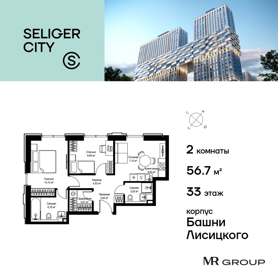 Прямая продажа от застройщика. Продаётся 2-к квартира общей площадью 56.78 кв. м с предчистовой отделкой в ЖК «Селигер Сити» на 33-м этаже башни Лисицкого. Корпуса четвертой очереди ЖК «Селигер сити» названы в честь трех великих представителей науки и архитектуры, новаторское видение которых — слишком смелое для своего времени — нашло воплощение в уникальных домах жилого комплекса. Вдохновленные авангардными идеями знаменитого советского архитектора Эля Лисицкого, архитекторы создали яркий центр притяжения всего района, задающий новый стандарт жизни в современном мегаполисе — две высокие «Башни Лисицкого» с современной интерпретацией горизонтального небоскреба. Преимущества проекта: Первые три очереди сданы. • 2 минуты пешком от метро «Селигерская» • Архитектурное решение от голландского бюро MLA + • 8 корпусов разной этажности от 8 до 45 этажей • Одна из самых больших придомовых территорий в Москве — размером с 4 футбольных поля • Огороженная охраняемая территория, круглосуточное видеонаблюдение • Европейский подход к благоустройству от бюро WOWHaus: детские площадки для разных возрастов, спортивные площадки, площадки воркаута, дорожки для бега и пеших прогулок, скейтпарк, хоккейная площадка, площадка для выгула собак • Искусственный пруд на территории комплекса с благоустроенной набережной и мостом • Продуманная концепция инфраструктуры: уютные кафе и рестораны, супермаркет, магазин фермерских продуктов, бытовые службы, салон красоты, детские сады • Панорамные окна высотой до 2,5 м, в корпусах 3 очереди витражное остекление высотой до 4,2 м • Широкий выбор квартир — от компактных студий до просторных квартир с тремя спальнями и пентхаусов • Четыре вида дизайнерской отделки квартир от бюро Вlank Architects • Возможность купить квартиру с предчистовой отделкой white box • «Умный дом» на платформе Ujin. Система безопасности, вход на территорию и в подъезд по биометрии или BLE-метке, въезд в паркинг по считывателю номера, контроль климата. Все для комфортной жизни! • Лобби по индивидуальному дизайн проекту от европейского бюро Вlank Architects: лаунж-зоны, ресепшен, колясочная, помещение для мытья лап животным после прогулки • Подземный паркинг на 2189 машино-мест по индивидуальному дизайну, с зарядными устройствами для электромобилей, постами для подкачки шин и келлерами • Надежный девелопер с опытом премиальных проектов MR Group Расположение комплекса: • 2 минуты от станции метро «Селигерская» • 7 минут на машине до станции метро «Окружная» • Предусмотрен удобный выезд в сторону ТТК (всего 9 км или 15 минут без пробок) • МКАД в 10 минутах на машине Компания MR Group предлагает своим клиентам специальные условия приобретения квартир в рамках программ ипотечного кредитования от банков-партнеров.О застройщике