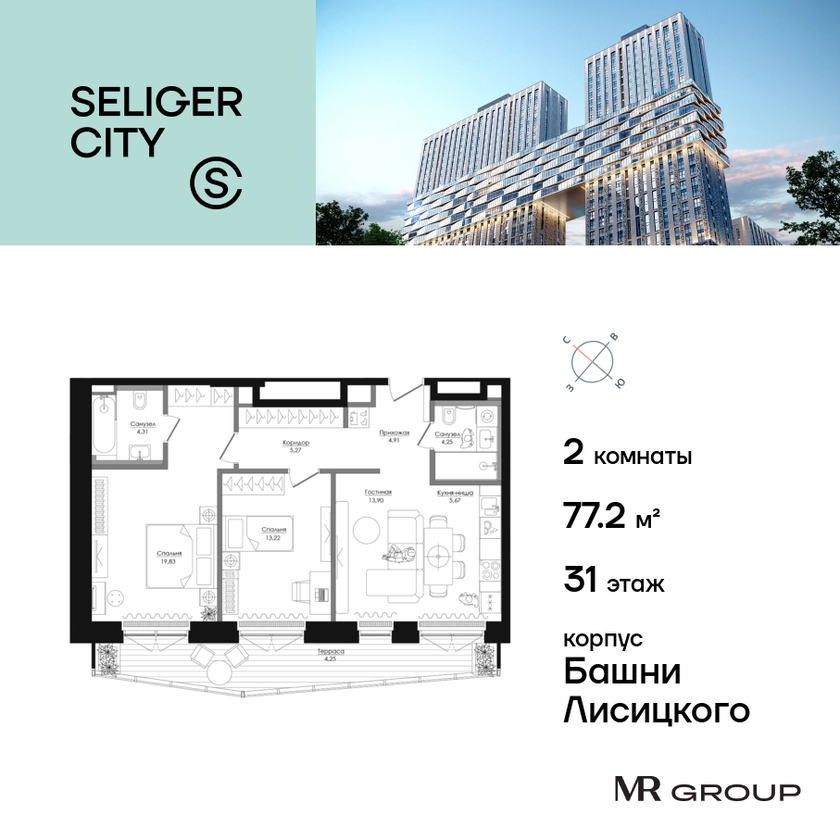 Прямая продажа от застройщика. Продаётся 2-к квартира общей площадью 77.27 кв. м без отделки в ЖК «Селигер Сити» на 31-м этаже башни Лисицкого. Корпуса четвертой очереди ЖК «Селигер сити» названы в честь трех великих представителей науки и архитектуры, новаторское видение которых — слишком смелое для своего времени — нашло воплощение в уникальных домах жилого комплекса. Вдохновленные авангардными идеями знаменитого советского архитектора Эля Лисицкого, архитекторы создали яркий центр притяжения всего района, задающий новый стандарт жизни в современном мегаполисе — две высокие «Башни Лисицкого» с современной интерпретацией горизонтального небоскреба. Преимущества проекта: Первые три очереди сданы. • 2 минуты пешком от метро «Селигерская» • Архитектурное решение от голландского бюро MLA + • 8 корпусов разной этажности от 8 до 45 этажей • Одна из самых больших придомовых территорий в Москве — размером с 4 футбольных поля • Огороженная охраняемая территория, круглосуточное видеонаблюдение • Европейский подход к благоустройству от бюро WOWHaus: детские площадки для разных возрастов, спортивные площадки, площадки воркаута, дорожки для бега и пеших прогулок, скейтпарк, хоккейная площадка, площадка для выгула собак • Искусственный пруд на территории комплекса с благоустроенной набережной и мостом • Продуманная концепция инфраструктуры: уютные кафе и рестораны, супермаркет, магазин фермерских продуктов, бытовые службы, салон красоты, детские сады • Панорамные окна высотой до 2,5 м, в корпусах 3 очереди витражное остекление высотой до 4,2 м • Широкий выбор квартир — от компактных студий до просторных квартир с тремя спальнями и пентхаусов • Четыре вида дизайнерской отделки квартир от бюро Вlank Architects • Возможность купить квартиру с предчистовой отделкой white box • «Умный дом» на платформе Ujin. Система безопасности, вход на территорию и в подъезд по биометрии или BLE-метке, въезд в паркинг по считывателю номера, контроль климата. Все для комфортной жизни! • Лобби по индивидуальному дизайн проекту от европейского бюро Вlank Architects: лаунж-зоны, ресепшен, колясочная, помещение для мытья лап животным после прогулки • Подземный паркинг на 2189 машино-мест по индивидуальному дизайну, с зарядными устройствами для электромобилей, постами для подкачки шин и келлерами • Надежный девелопер с опытом премиальных проектов MR Group Расположение комплекса: • 2 минуты от станции метро «Селигерская» • 7 минут на машине до станции метро «Окружная» • Предусмотрен удобный выезд в сторону ТТК (всего 9 км или 15 минут без пробок) • МКАД в 10 минутах на машине Компания MR Group предлагает своим клиентам специальные условия приобретения квартир в рамках программ ипотечного кредитования от банков-партнеров.О застройщике