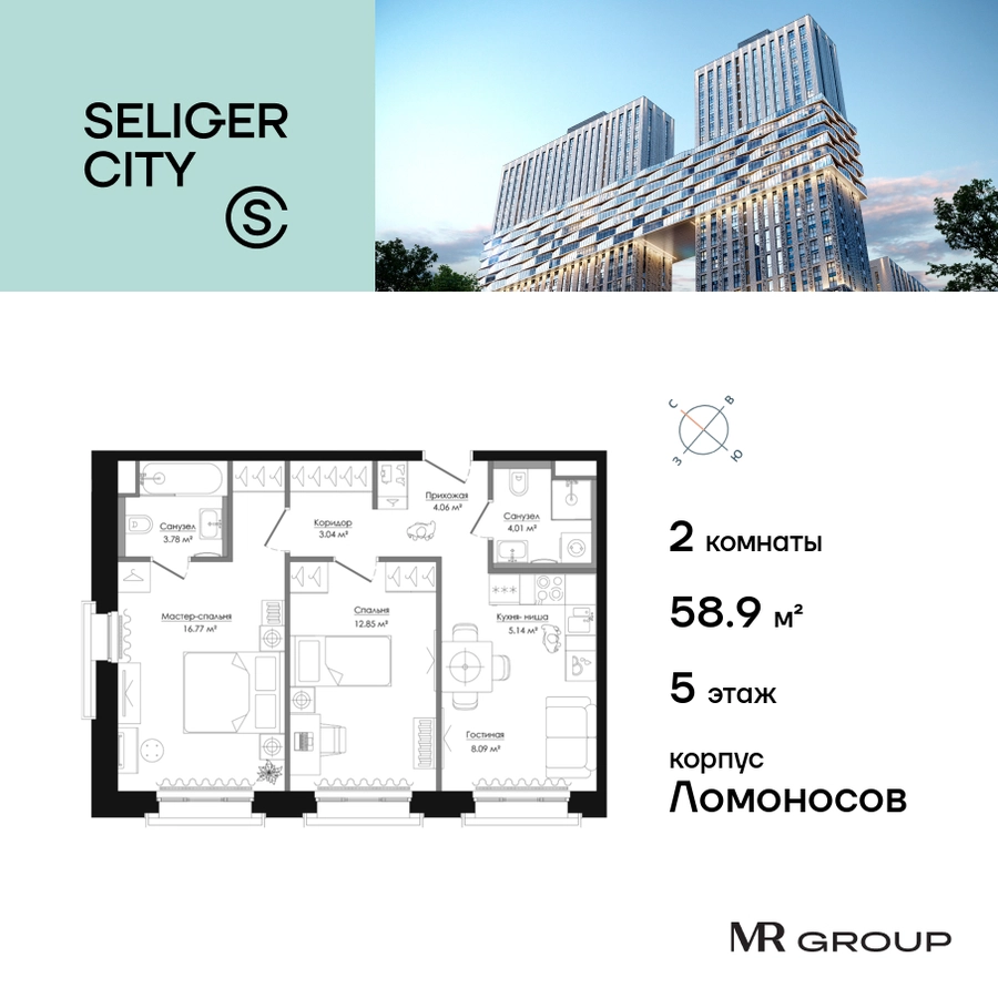 Прямая продажа от застройщика. Продаётся 2-к квартира общей площадью 58.95 кв. м без отделки в ЖК «Селигер Сити» на 5-м этаже корпуса Ломоносов. Корпуса четвертой очереди ЖК "Селигер сити" названы в честь трех великих представителей науки и архитектуры, новаторское видение которых слишком смелое для своего времени нашло воплощение в уникальных домах жилого комплекса. Клубный 15-этажный корпус Ломоносов расположен во дворе 4 очереди. Фасад корпуса выполнен из темного кирпича с контрастным первым этажом. Квартиры верхних этажей имеют панорамные окна и балконы с декоративным ограждением. Часть квартир на втором этаже имеют открытые террасы. На первом этаже дизайнерские интерьеры лобби выполненные по проекту бюро Вlank Architects. На жилых этажах не более 5 квартир. Преимущества проекта: • 2 минуты пешком от метро «Селигерская» • Архитектурное решение от голландского бюро MLA + • Одна из самых больших придомовых территорий в Москве • Огороженная охраняемая территория, круглосуточное видеонаблюдение • Европейский подход к благоустройству от бюро WOWHaus: появится парадный бульвар, аллея с фонтаном и арт-объектом, что дополнит уже сформированное благоустройство: детские площадки для разных возрастов, площадки для воркаута, дорожки для бега и пеших прогулок, места для отдыха • Искусственный пруд на территории комплекса с благоустроенной набережной и мостом • Продуманная концепция инфраструктуры: уютные кафе и рестораны, супермаркет, магазин фермерских продуктов, бытовые службы, салон красоты, детские сады • Ультрасовременные инженерные решения • Подземный паркинг с зарядными станциями для электромобилей, постами подкачки шин и келлерами • Лобби по индивидуальному дизайн проекту от европейского бюро Вlank Architects: лаунж-зоны, ресепшен, колясочная, помещение для мытья лап животным после прогулки • Надежный девелопер с опытом премиальных проектов MR Group Расположение комплекса: • 2 минуты от станции метро «Селигерская» • 7 минут на машине до станции метро «Окружная» • Предусмотрен удобный выезд в сторону ТТК (всего 9 км или 15 минут без пробок) • МКАД в 10 минутах на машине Компания MR Group предлагает своим клиентам специальные условия приобретения квартир в рамках программ ипотечного кредитования от банков-партнеров.О застройщике