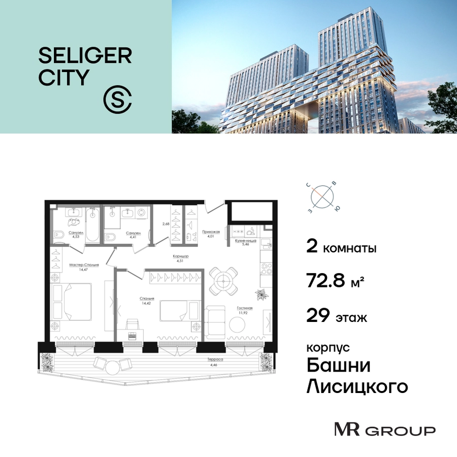Прямая продажа от застройщика. Продаётся 2-к квартира общей площадью 73.74 кв. м с предчистовой отделкой в ЖК «Селигер Сити» на 29-м этаже башни Лисицкого. Корпуса четвертой очереди ЖК «Селигер сити» названы в честь трех великих представителей науки и архитектуры, новаторское видение которых — слишком смелое для своего времени — нашло воплощение в уникальных домах жилого комплекса. Вдохновленные авангардными идеями знаменитого советского архитектора Эля Лисицкого, архитекторы создали яркий центр притяжения всего района, задающий новый стандарт жизни в современном мегаполисе — две высокие «Башни Лисицкого» с современной интерпретацией горизонтального небоскреба. Преимущества проекта: Первые три очереди сданы. • 2 минуты пешком от метро «Селигерская» • Архитектурное решение от голландского бюро MLA + • 8 корпусов разной этажности от 8 до 45 этажей • Одна из самых больших придомовых территорий в Москве — размером с 4 футбольных поля • Огороженная охраняемая территория, круглосуточное видеонаблюдение • Европейский подход к благоустройству от бюро WOWHaus: детские площадки для разных возрастов, спортивные площадки, площадки воркаута, дорожки для бега и пеших прогулок, скейтпарк, хоккейная площадка, площадка для выгула собак • Искусственный пруд на территории комплекса с благоустроенной набережной и мостом • Продуманная концепция инфраструктуры: уютные кафе и рестораны, супермаркет, магазин фермерских продуктов, бытовые службы, салон красоты, детские сады • Панорамные окна высотой до 2,5 м, в корпусах 3 очереди витражное остекление высотой до 4,2 м • Широкий выбор квартир — от компактных студий до просторных квартир с тремя спальнями и пентхаусов • Четыре вида дизайнерской отделки квартир от бюро Вlank Architects • Возможность купить квартиру с предчистовой отделкой white box • «Умный дом» на платформе Ujin. Система безопасности, вход на территорию и в подъезд по биометрии или BLE-метке, въезд в паркинг по считывателю номера, контроль климата. Все для комфортной жизни! • Лобби по индивидуальному дизайн проекту от европейского бюро Вlank Architects: лаунж-зоны, ресепшен, колясочная, помещение для мытья лап животным после прогулки • Подземный паркинг на 2189 машино-мест по индивидуальному дизайну, с зарядными устройствами для электромобилей, постами для подкачки шин и келлерами • Надежный девелопер с опытом премиальных проектов MR Group Расположение комплекса: • 2 минуты от станции метро «Селигерская» • 7 минут на машине до станции метро «Окружная» • Предусмотрен удобный выезд в сторону ТТК (всего 9 км или 15 минут без пробок) • МКАД в 10 минутах на машине Компания MR Group предлагает своим клиентам специальные условия приобретения квартир в рамках программ ипотечного кредитования от банков-партнеров.О застройщике